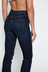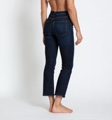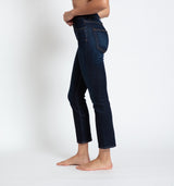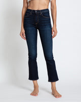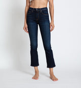 Slim fit, high rise vintage inspired jean with a cropped inseam and slight kick flare at the ankle. Light weight denim with comfort stretch.