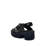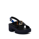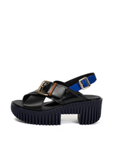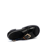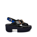 Plia Juno Black platform sandals comes with silver buckles and contrasted small details in blue and brown.