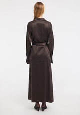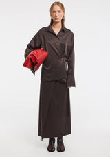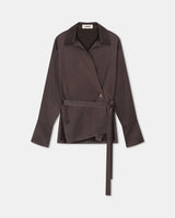 The NEEL satin wrap shirt is a fluid piece features a soft collar, extended cuffs, and a wrap front that ties at the waist, offering a flattering silhouette with subtle structure. Detailed with our signature A-motif button, it combines modern elegance and smart design.