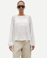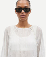 Long-sleeved semi-sheer blouse with a loose fit. Button closure at one shoulder. Main material made from 100% recycled polyester. This product is GRS certified. Each stage of the supply chain has met strict social, environmental, and chemical requirements.