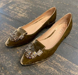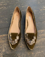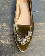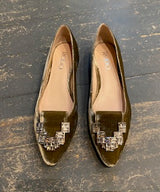 The Velvet Pointed Slipper flat, feminine and contemporary, is presented in soft velvet and is distinguished by its Art Deco’ inspired jewel brass buckle, enriched with baguette and square crystals applied by hand.