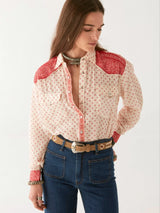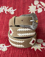 Its camel, sandal-like strap contrasts strikingly with white leather accents, forming intricate flower shapes that travel the length of the belt. Finished with an antique vintage silver buckle, it’s a belt that makes a statement while honoring tradition.