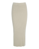 This long knit skirt flatteringly follows your body's contours for a stunning silhouette. Just add a simple T-shirt for an outfit that is simultaneously comfortable and chic. Or, create a lovely outfit by combining it with the Saku Knit blouse.