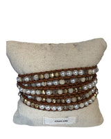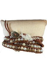 Intricately woven in natural tan leather creating a dramatic new addition to our bestselling wrap bracelet collections. Mixes beautifully to spice up your 'real' jewelry or makes a statement on its own.