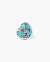 This 14k yellow gold oasis ring features a vibrant turquoise stone with a sliced .4 ct diamond inlay. Each turquoise stone is unique so patterning and size may vary.
