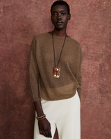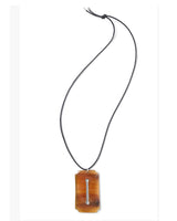 Jasper anchors this simple piece, cut into an abstract take on the classic keyhole motif. The pendant is hung from silver tipped dark brown leather cord which softens and molds to your body over time, becoming a deeply personal artifact.