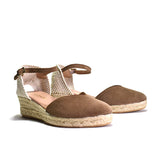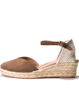 Closed-toe espadrille with woven heel cup. Suede ankle strap adjustable metal buckle. Jute wrapped wedge. Lightly padded leather footbed. Leather lining. Synthetic sole. Made in Spain.