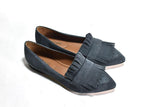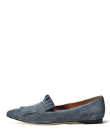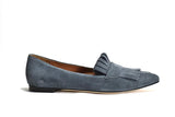Flat fringed loafter made using the ever-so-comfortable sacchetto construction. Suede or leather upper. Slip on. Leather lining. Leather sole with synthetic heel. Padded footbed. Made in Italy.