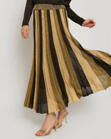 This long skirt features multiple panels of shimmering Lurex® mesh in three different hues. It’s fully lined with soft taupe fabric and has a comfy elastic waistband. The model is 1.72m tall and wears a size S, with a total length of 89cm for that size. Crafted from Italian mesh and made in Turkey, it’s a playful piece that dances with every step.