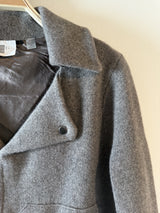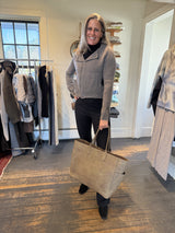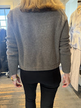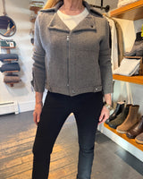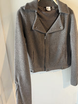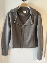 This grey long sleeve moto jacket is 100% cashmere. It has a spread collar with snap buttoned lapels, side slant pockets, bottom snap button closures and zips in the front. You will reach for it time and time again. I do!