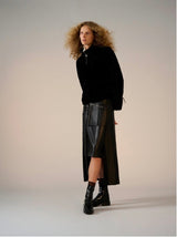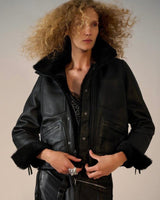 Reversible bomber jacket with dramatic collar and zipper details on the sleeve. A lush shearling on one side and a sleek leather on the other.