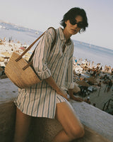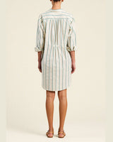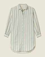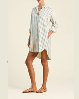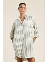 The Callie Shirtdress is a short shirtdress with a covered front button placket, folded collar and full length sleeves with gathered cuffs. Featuring signature fabric tab gathers at the back waist for added shape, and hidden side seam pockets. Shown here in Verde Stripes and made from cotton beach oxford.