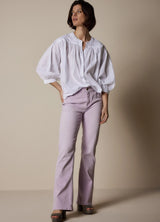This cotton voile blouse is light and flowy. The top has a high, round neckline and button fastening. It has pleats running from the collarbones all the way to the bottom. The round hem falls nicely around your back and also looks great tucked into high-waisted jeans or trousers.