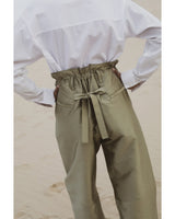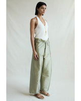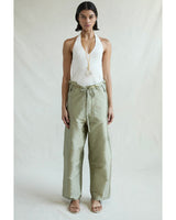 The Techno Taffeta Barrel Pant features a wide leg silhouette in a silky sage fabric with a subtle sheen. Wide legs, functional belt loops, and adjustable ties at front and back. If in between sizes, size up for a relaxed fit or size down for a fitted look.