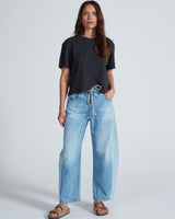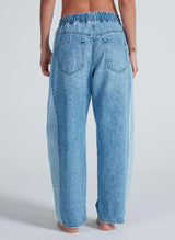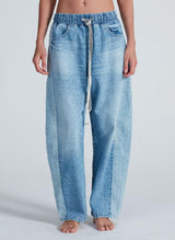 Relaxed, easy fit with wide legs and a slightly cropped length. Made from Japanese denim in our light Berkeley wash. Features an elastic waistband with a detailed rope drawstring
