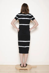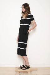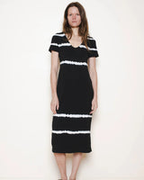 Raquel Allegra's Chica dress is a maxi-length dress with a scoop neck, short sleeves, and pockets at the hip. Made in our signature jersey, this dress is designed for a relaxed fit. White halos in Black, Indigo, and Kelly Green colorways are made by hand, using a resist dye technique that produces the white stripes and creates subtle variations in each garment.