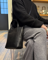 - Rich black leather front pocket tote with handles and a strap to wear over the shoulder. Great size makes it the perfect little accessory