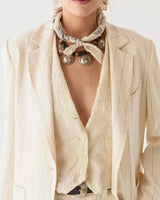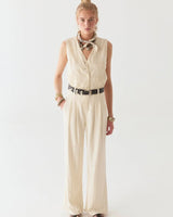 Stolen from the gentlemen. Crisp yet undone, this ivory cotton vest walks the line between structure and nonchalance. Subtle embroidery weaves through the fabric, a quiet detail meant for those who notice.