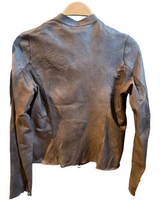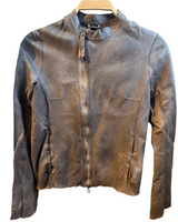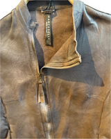 Specializing in handmade leather pieces using various old-world techniques and modern treatment methods, Marco Delli is inspired by the west and spirit of rock n roll. The Fender Jacket features an asymmetric double ended zipper with ribbed fabric panels at the side and zippers at the cuffs.