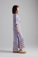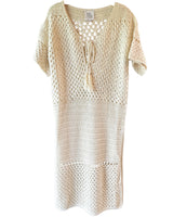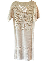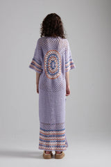 The Luna Kaftan is a meticulously hand-crocheted maxi kaftan dress featuring a stunning full moon design on the back.