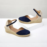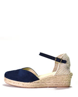 Closed-toe espadrille with woven heel cup. Suede ankle strap adjustable metal buckle. Jute wrapped wedge. Lightly padded leather footbed. Leather lining. Synthetic sole. Made in Spain.