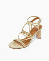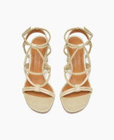 The Glaze heel is made for moments that call for elegance and a touch of glamour. Crafted in champagne metallic suede, this strappy sandal wraps the foot with intricate, tubular straps and secures with an adjustable buckle for the perfect fit. The sculpted solid Ash wood heel, reinforced with internal steel, offers surprising comfort and stability while maintaining a sleek, refined profile. Designed for special occasions, the Glaze heel brings a modern, minimal edge to your party look, seamlessly blending sophistication and practicality for nights that deserve to be remembered.