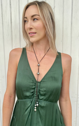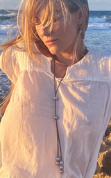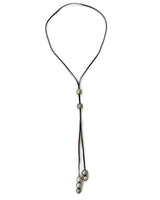 This luxuriously long 38" lariat is accented with seven large multi-color 11-13mm Tahitian pearls. The pearls can slide up and down to adjust to your desired length. This lariat adds a gorgeous element to compliment anything from a simple top to an elegant night out.