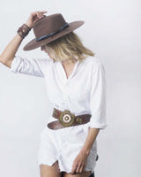 A new forever favorite and all-season best seller, TAOS is crafted from ethically sourced 100% virgin wool and finished with hand-dyed batik and leather lace. - Hand shaped - Ethically sourced, 100% virgin wool - Exterior band | Hand dyed batik cotton wrap | Leather lace - Interior sweatband | Leather - Long brim | 8-9 cm - Crown height | 10 10.5 cm