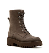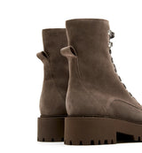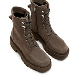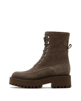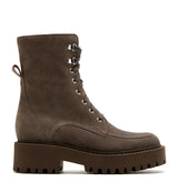 Suede bootie featuring a lace opening, a practical interior side zipper, a decorative pull-tab at the back, and a trendy chunky lug sole.