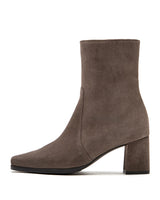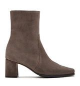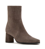 Dressy suede bootie featuring a square toe, a comfortable block heel, an interior side zipper, and a breathable microfiber lining.