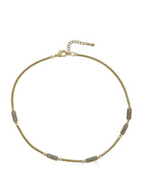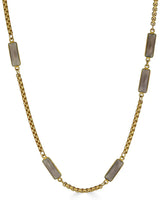 A beautiful statement necklace, this piece features a matte gold box chain, detailed with baguette cut gray moonstone gemstones along its length. Each necklace is a one-of-a-kind beauty.