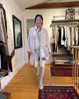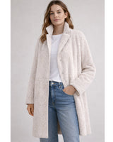 Reversible knee length coat with lapels. Shearling with leather trim.