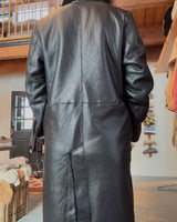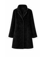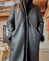 Reversible knee length coat with lapels. Shearling with leather trim.