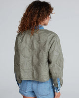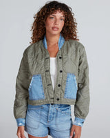 The Peak Liner is a lightweight quilted jacket designed for easy layering and everyday wear. Featuring a cropped, relaxed silhouette with subtle denim contrast details, this style blends utility with a laid-back sensibility. Finished with snap closures and soft quilted texture, it's an effortless outer layer that works across seasons.