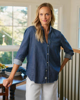 - Signature bust flattering button placement and long sleeves with button cuffs