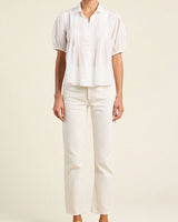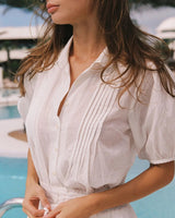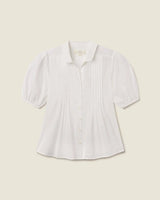 The Nadine Blouse is a short-puff sleeved blouse with a flattering curved hemline and petite pintucks that lend texture and hand crafted charm.