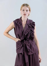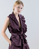 This sleeveless wrap top, crafted from taffeta, stands out for its subtle sheen and structured silhouette, which lends presence and elegance. The notched lapels add a modern, defined touch, while the large patch pockets at the bottom provide a functional yet stylish look.