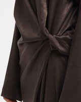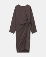 The STEAM satin midi dress features a soft drape and a sculptural knot detail at the waist, creating natural gathers that flatter the body with ease. Ideal for both day and evening, it brings together comfort and sophistication.