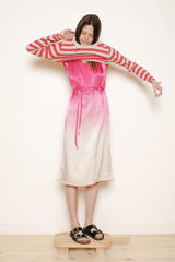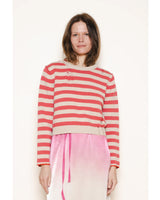 The Clark Pullover is a cropped cotton cashmere crew neck sweater featuring the brand’s signature drop stitches, lending a bit of playfulness and the feel of a well-loved passed-down sweater. Red thread crochet detailing at the cuffs symbolizes good luck, fortune, and protection. Available in Cerise Stripe and Cream.