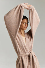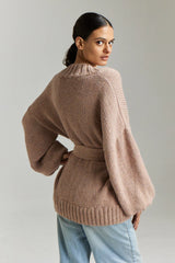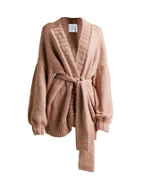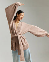 An iconic jersey knit cardigan boasting an oversized silhouette - luxuriously handcrafted in Peru with 100% Baby Alpaca - envelops the wearer in cozy comfort, cinched with an elegant tie.