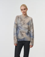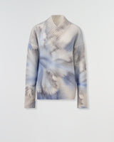 A beautiful blend of overlapping cashmere and silk boucle V-neck sweater with a hand and printed floral print in shades of blue. There is ribbing details at the neck, waist and sleeveless. Wear with blue jeans, creme or grey pants.