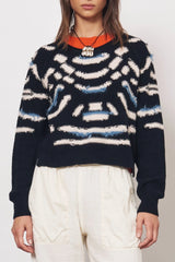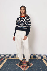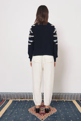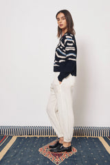 Our Zuri Pullover Sweater is an upgrade to an already top-selling long-sleeve sweater silhouette. Purposefully done inside out for raw edge detailing, this quietly-cropped crew neck comes in a pastel palette of light denim and chalk or a seasonless graphic black and white.