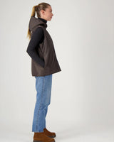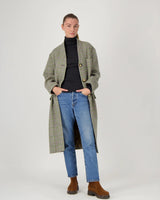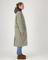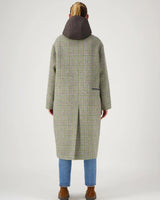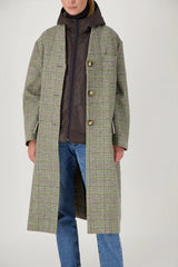 This Green Check coat features a collarless wool design paired with a removable hooded down jacket. Crafted from 100% water-repellent wool, it measures 110 cm long, combining practicality with a fun twist.
