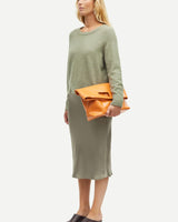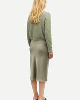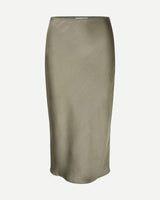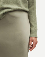 Midi length skirt with a bias cut slim fit and softly flared hem. Decorative waist trim. Recycled polyester blend fabric with subtle sheen.