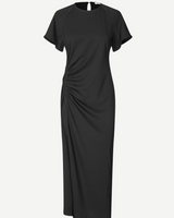 Short-sleeved maxi dress with a regular fit. Button and loop closure at the back and invisible zipper on the side. Fixed gathering at the side. Slit at the leg. Main material made from 100% recycled polyester. This product is GRS certified. Each stage of the supply chain has met strict social, environmental, and chemical requirements.