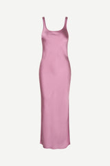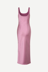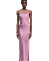 Slim fitting bias cut maxi dress with scooped front and back necklines. Darted bust and waist, hem slit. Bias cut 100% recycled polyester fabric with subtle sheen. This product is GRS certified. Each stage of the supply chain has met strict social, environmental, and chemical requirements.