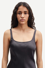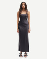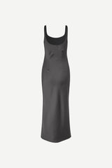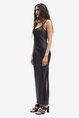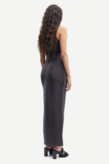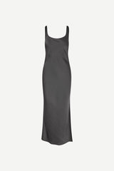 Slim fitting sleeveless midi dress with scooped front and back necklines. Darted bust and waist, hem slit. Bias cut 100% recycled polyester fabric with subtle sheen. This product is GRS certified. Each stage of the supply chain has met strict social, environmental, and chemical requirements.