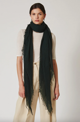 Our signature cashmere and silk blend scarf in a dark green hue. Super soft and lightweight with a fringed trim. This scarf is perfect for year-round wear.