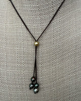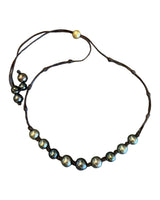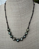 The seven seas refers to all the worlds oceans and each of the seven beautiful pearls on this strand represents each one. While these Tahitian pearls are all sourced in the Pacific Ocean in French Polynesia, how we hope to travel to all seven sea’s! This necklace features one gorgeous 14-15mm Tahitian pearl at its center with eight 11-13mm Tahitian pearls surrounding it and 4 dangling at the ends. With an adjustable length, it can be worn as a choker or longer length. Total of 14 pearls.