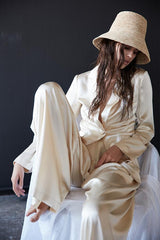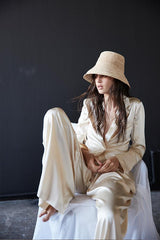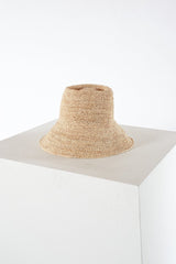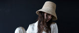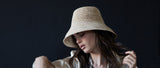 A natural straw bucket hat made for summer. This short-brimmed crochet bucket hat was intricately crocheted to create a flexible and structured design. This effortless bucket hat can easily be worn year-round and is meant for traveling with you wherever you go whether in a suitcase, a purse or a beach bag.